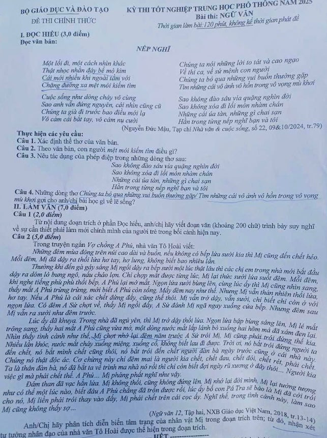 Đây cũng là năm mà đề bài tự luận rơi vào tác phẩm “Vợ chồng A Phủ” (Tô Hoài), với yêu cầu thí sinh phân tích tâm trạng và hành động của nhân vật Mị trong đêm cứu A Phủ.