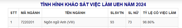 Theo báo cáo tình hình khảo sát việc làm tại Đại học Kinh tế TP.HCM (UEH) năm 2024, ngành ngôn ngữ Anh có tỷ lệ sinh viên tốt nghiệp có việc làm đạt 98,86%, cao thứ 2 toàn trường sau ngành Bảo hiểm và Logistics (100%). Tình hình khảo sát việc làm UEH các năm gần đây cho thấy tỷ lệ sinh viên có việc làm ngành ngôn ngữ Anh dao động 93-100%.