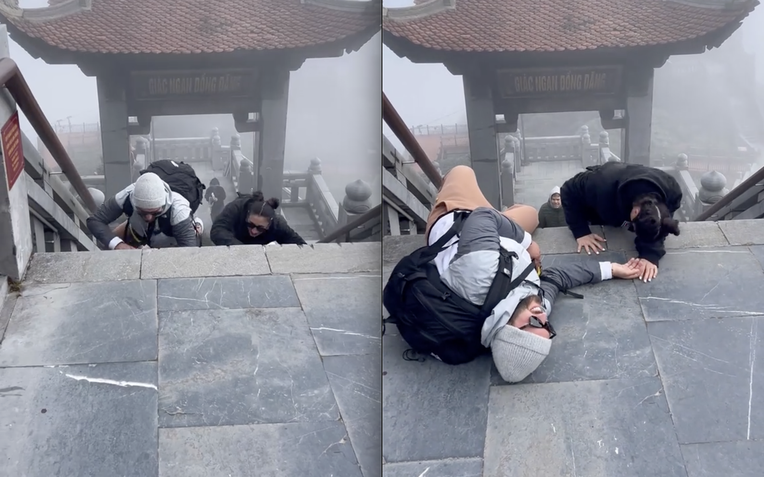 Những bậc thang nối tiếp nhau, độ cao tăng dần, không khí loãng hơn khiến sức lực của hai du khách nhanh chóng cạn kiệt. Cao trào của đoạn video là hình ảnh cả hai… bò lết trên từng bậc thang, tay chống đất, người cúi rạp, cố gắng nhích từng chút một trong sự mệt mỏi thấy rõ. Khung cảnh này khiến người xem không khỏi bật cười vì vừa thương, vừa buồn cười trước sự "quá sức" của hai vị khách.