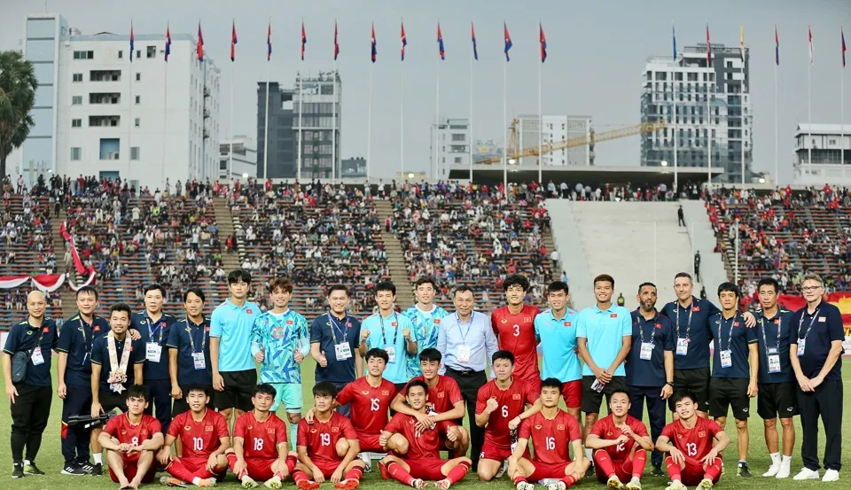 Đội bóng đá Việt Nam có tấm HCĐ tại SEA Games 32 ở Campuchia. Ảnh: VFF
