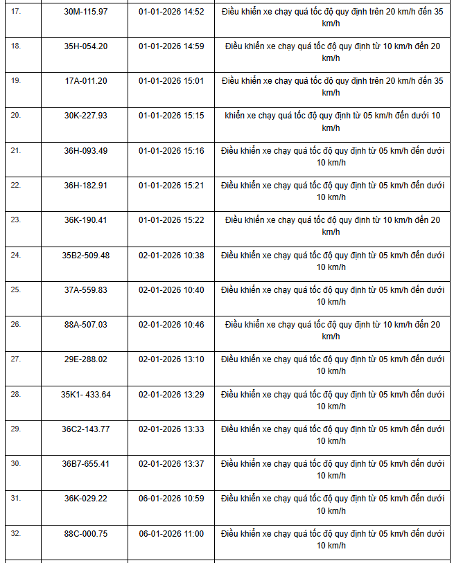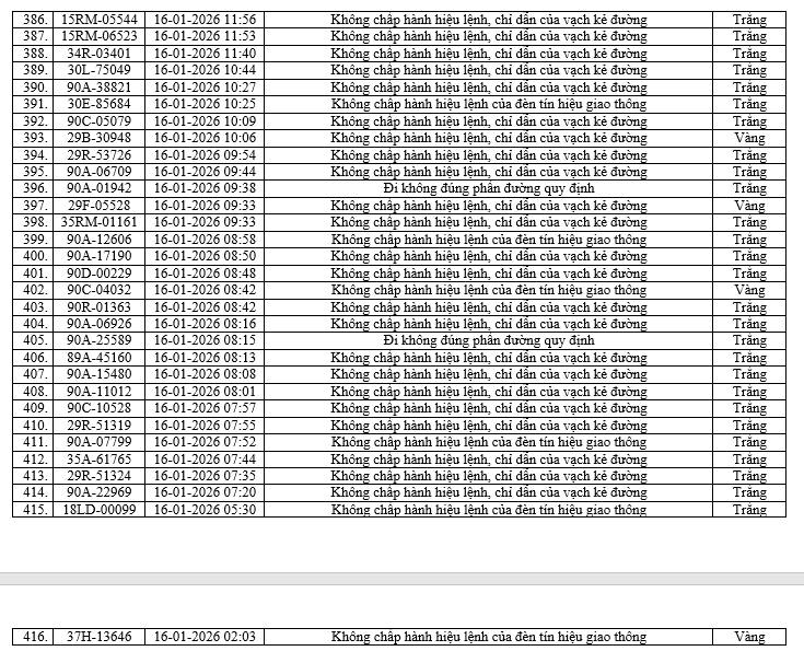 Mới đây, Phòng Cảnh sát giao thông (CSGT) công an tỉnh Ninh Bình, thông báo danh sách các phương tiện vi phạm trật tự, an toàn giao thông trên địa bàn tỉnh trong khoảng thời gian từ ngày 16/01/2026 đến ngày 22/01/2026.