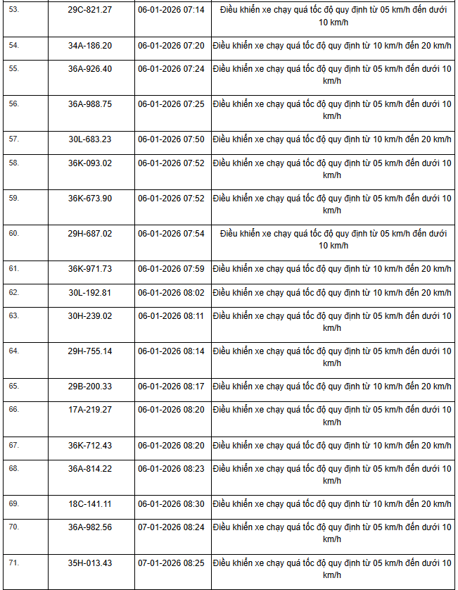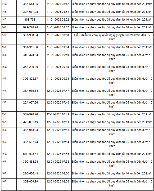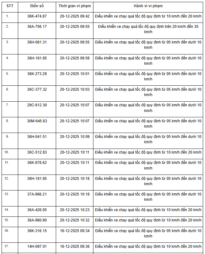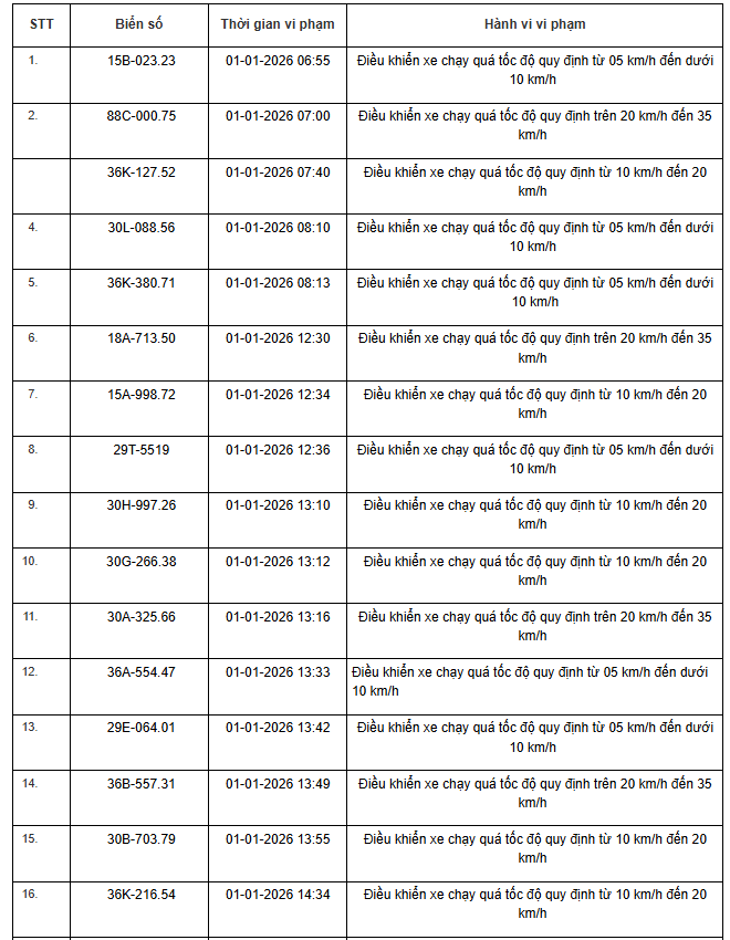 Từ ngày 01/01/2026 đến ngày 15/01/2025, thông qua thiết bị kỹ thuật nghiệp vụ, các tổ công tác của phòng Cảnh sát giao thông Thanh Hoá đã phát hiện, ghi nhận bằng hình ảnh đối với tổng số 359 trường hợp phương tiện vi phạm quy định về tốc độ trên tuyến Quốc lộ, đã gửi thông báo phục vụ “Xử phạt nguội”.