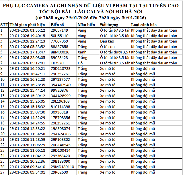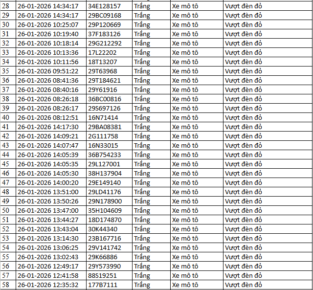Từ 12h00’ ngày 28/1/2026 đến 12h00’ ngày 29/1/2026, đã tự động phát hiện 100 trường hợp xe máy, ô tô vi phạm.