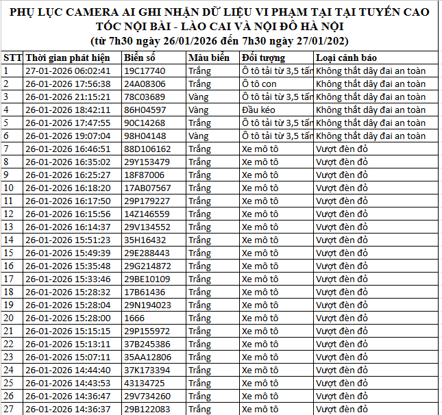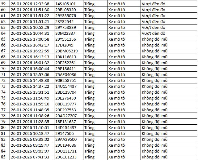 Từ 12h00’ ngày 26/1/2026 đến 12h00’ ngày 27/1/2026, đã tự động phát hiện 85 trường hợp xe máy, ô tô vi phạm.