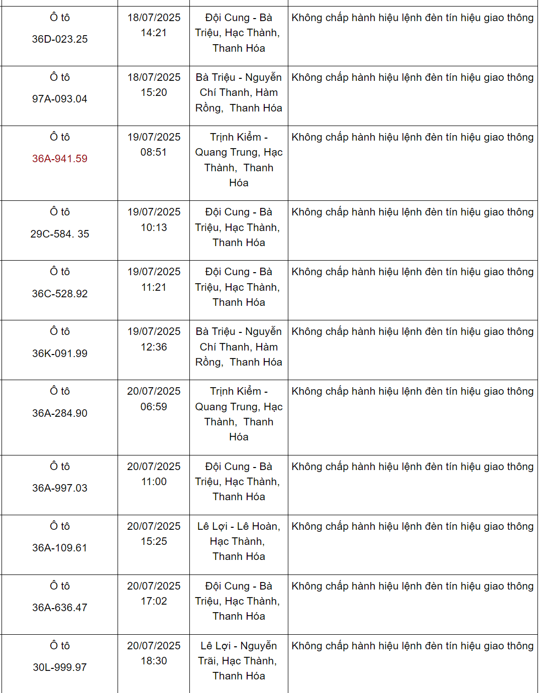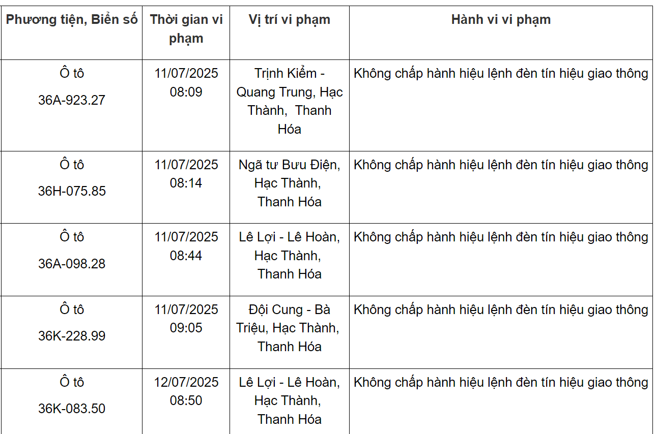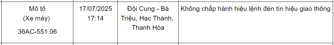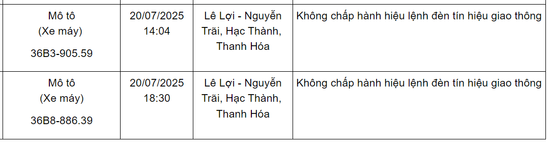Ngoài ra, Phòng CSGT Công an tỉnh Thanh Hoá cũng thông báo danh sách các phương tiện vi phạm về TTATGT đường bộ trên địa bàn từ ngày 15/7/2025 đến ngày 31/7/2025. Trong đó có 47 trường hợp vượt đèn đỏ như sau: