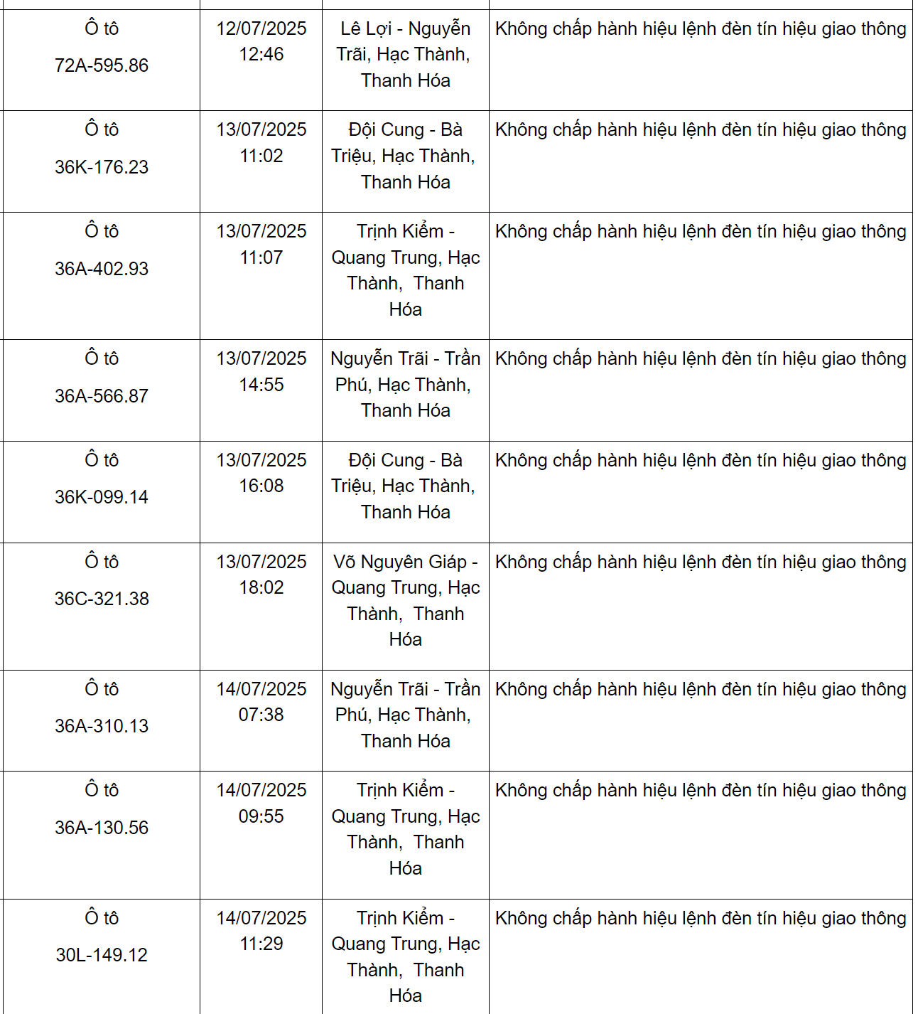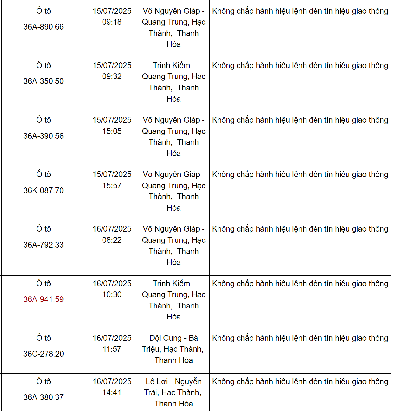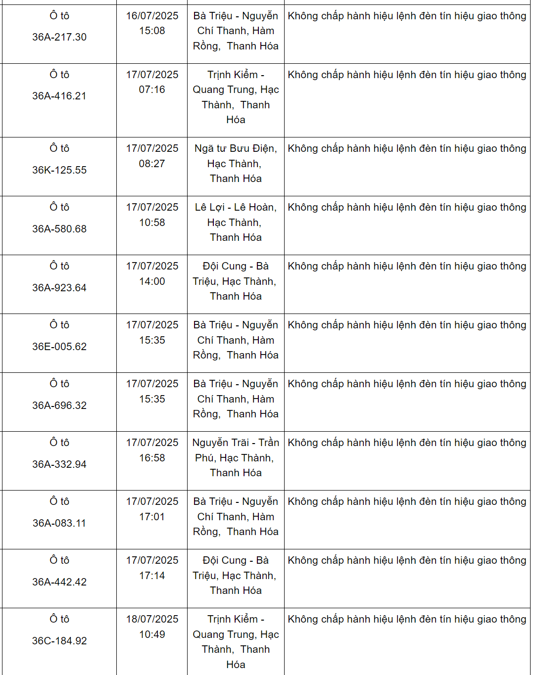 Ngoài ra, Phòng CSGT Công an tỉnh Thanh Hoá cũng thông báo danh sách các phương tiện vi phạm về TTATGT đường bộ trên địa bàn từ ngày 15/7/2025 đến ngày 31/7/2025. Trong đó có 47 trường hợp vượt đèn đỏ như sau: