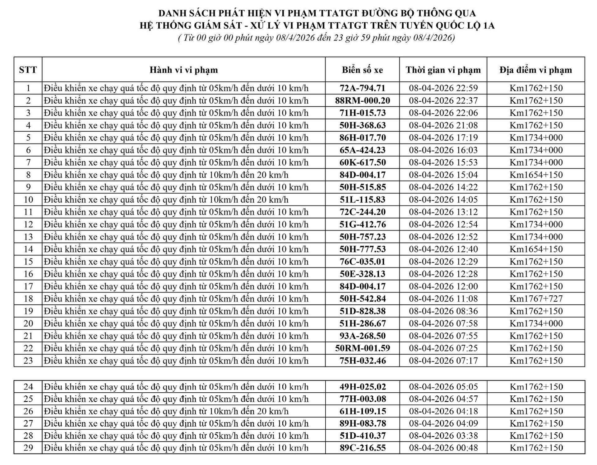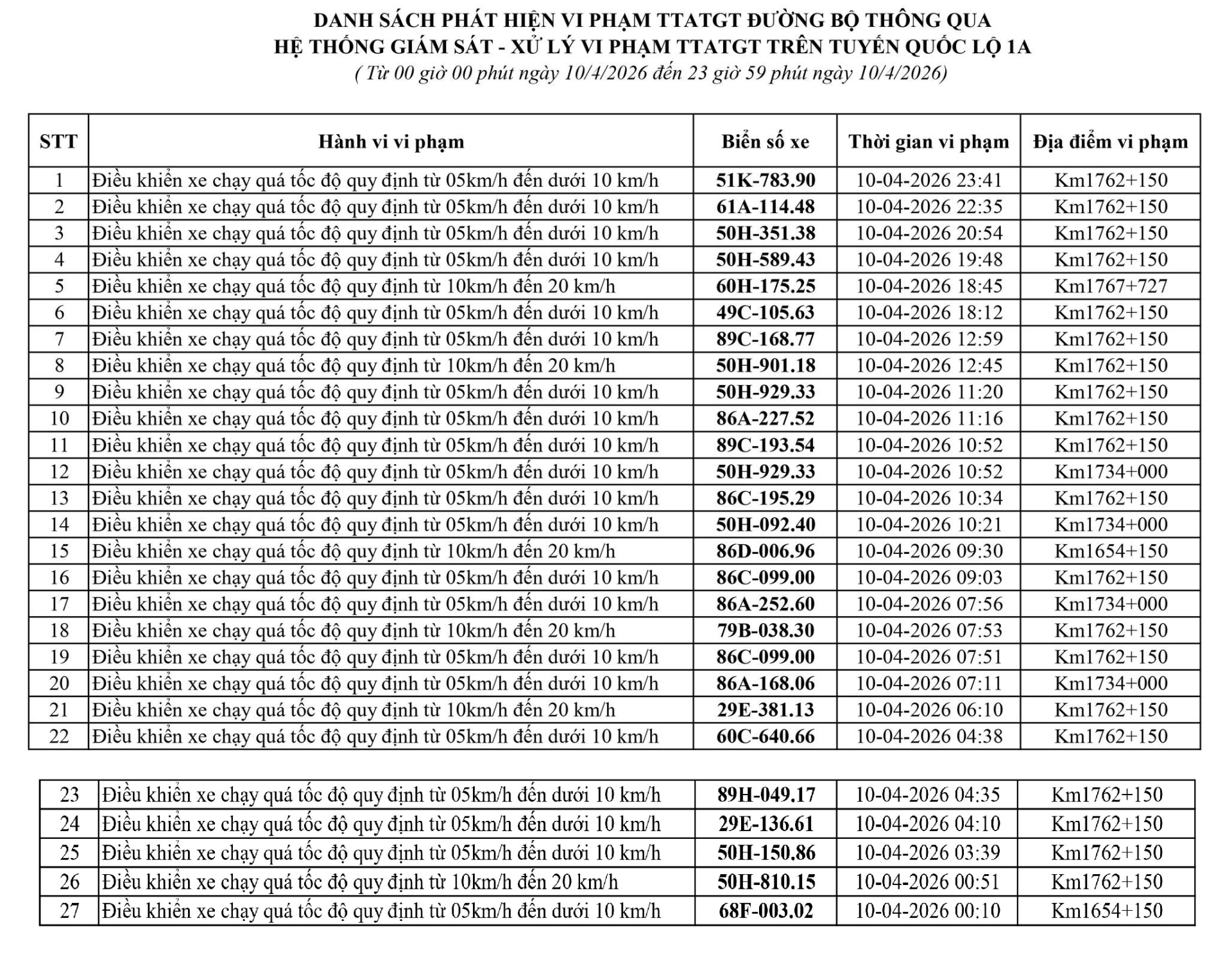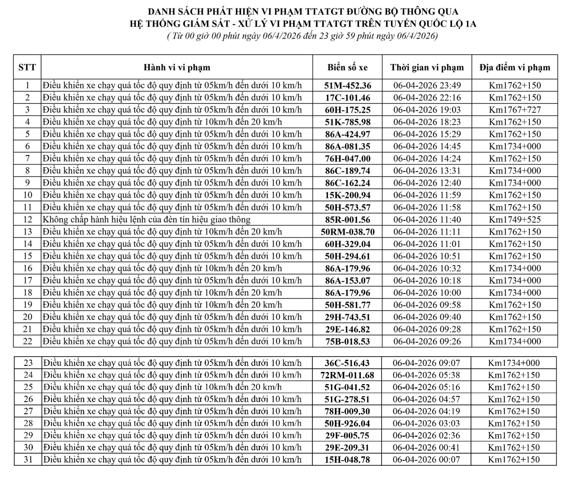 Phòng Cảnh sát giao thông Công an tỉnh Lâm Đồng thông báo, trong tuần từ ngày 06/04/2026 đến ngày 11/04/2026, đã phát hiện 164 trường hợp vi phạm trật tự an toàn giao thông - lỗi chạy quá tốc độ qua hệ thống camera giám sát giao thông và phương tiện thiết bị kỹ thuật nghiệp vụ.
