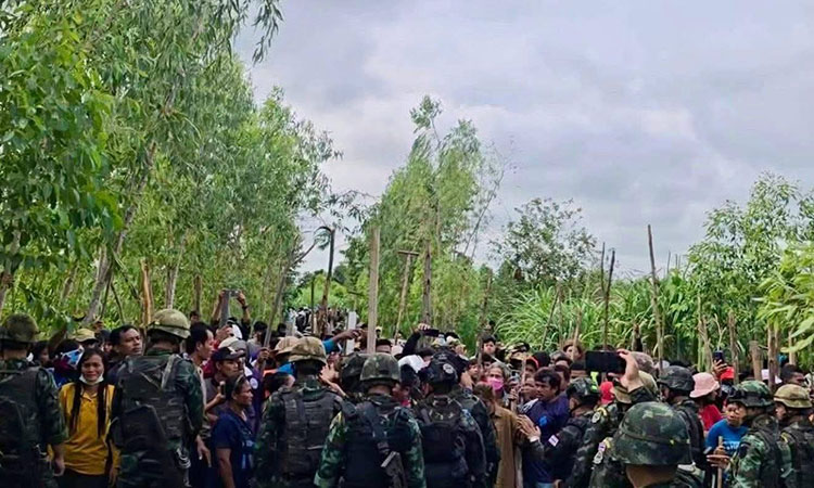 Dân làng Campuchia xô xát với quân đội và cảnh sát Thái Lan tại khu vực biên giới tranh chấp, khi họ cố gắng ngăn chặn lực lượng này lắp đặt thêm hàng rào thép gai. Ảnh: Quân đội Hoàng gia Thái Lan