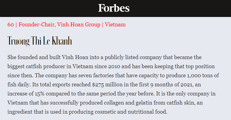 Bà Khanh được Forbes vinh danh là nhà sáng lập và phát triển Vĩnh Hoàn thành công ty đại chúng. Doanh nghiệp này là nhà sản xuất cá da trơn lớn nhất Việt Nam từ năm 2010 và luôn giữ vị trí dẫn đầu đến nay.