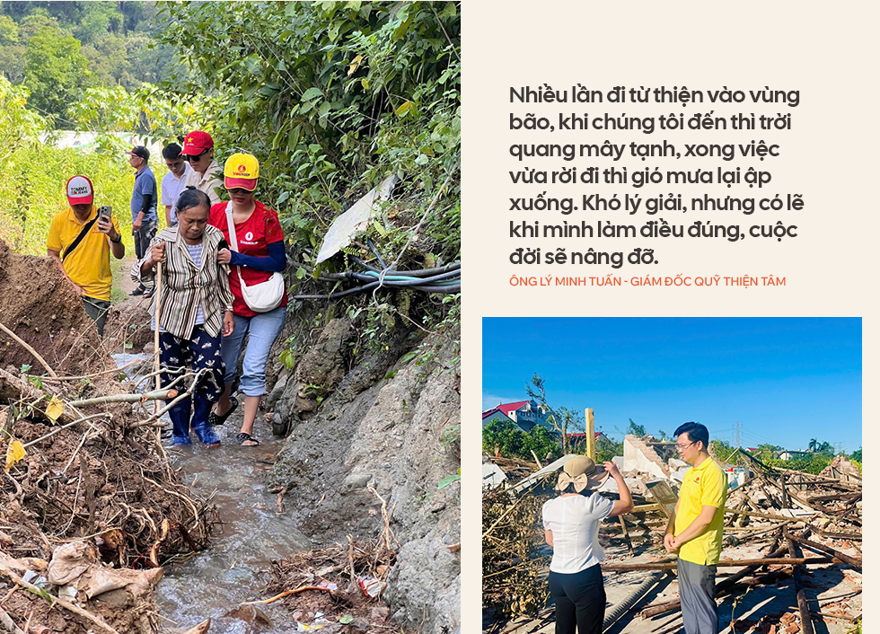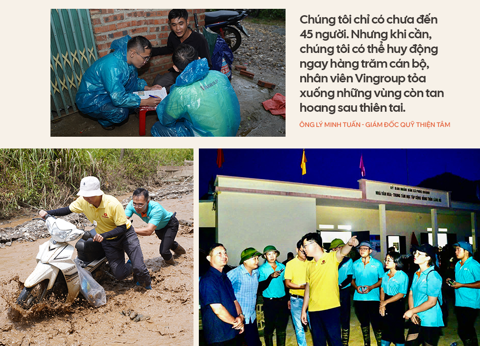 Quỹ Thiện Tâm làm đầu mối, điều phối lực lượng. Thực ra, chúng tôi chỉ có chưa đến 45 người. Nhưng khi cần, chúng tôi có thể huy động ngay hàng trăm cán bộ, nhân viên Vingroup tỏa xuống những vùng còn tan hoang sau thiên tai.
