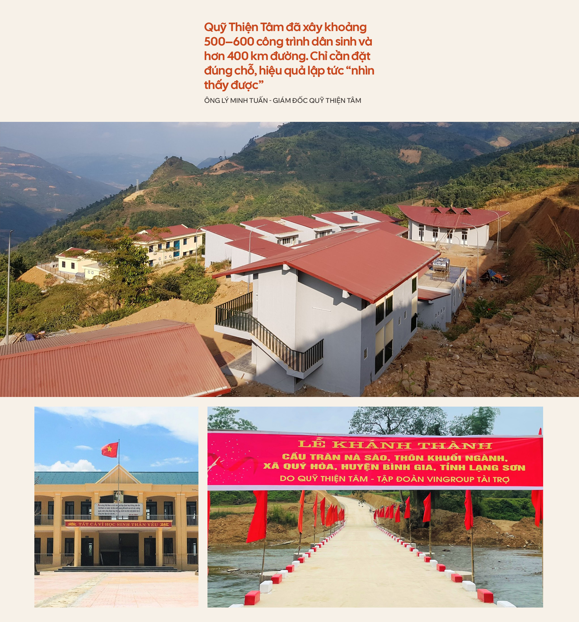 Quỹ Thiện Tâm đã xây khoảng 500–600 công trình dân sinh và hơn 400 km đường. Chỉ cần đặt đúng chỗ, hiệu quả lập tức “nhìn thấy được”. Như cây cầu ở thôn An Vượng (Tuyên Quang): chỉ một năm sau, cả vùng như bừng sáng. Nhà kiên cố mọc lên, ô-tô vào tận thôn, giá bán nông sản tăng nên kinh tế của địa phương được cải thiện rõ rệt.