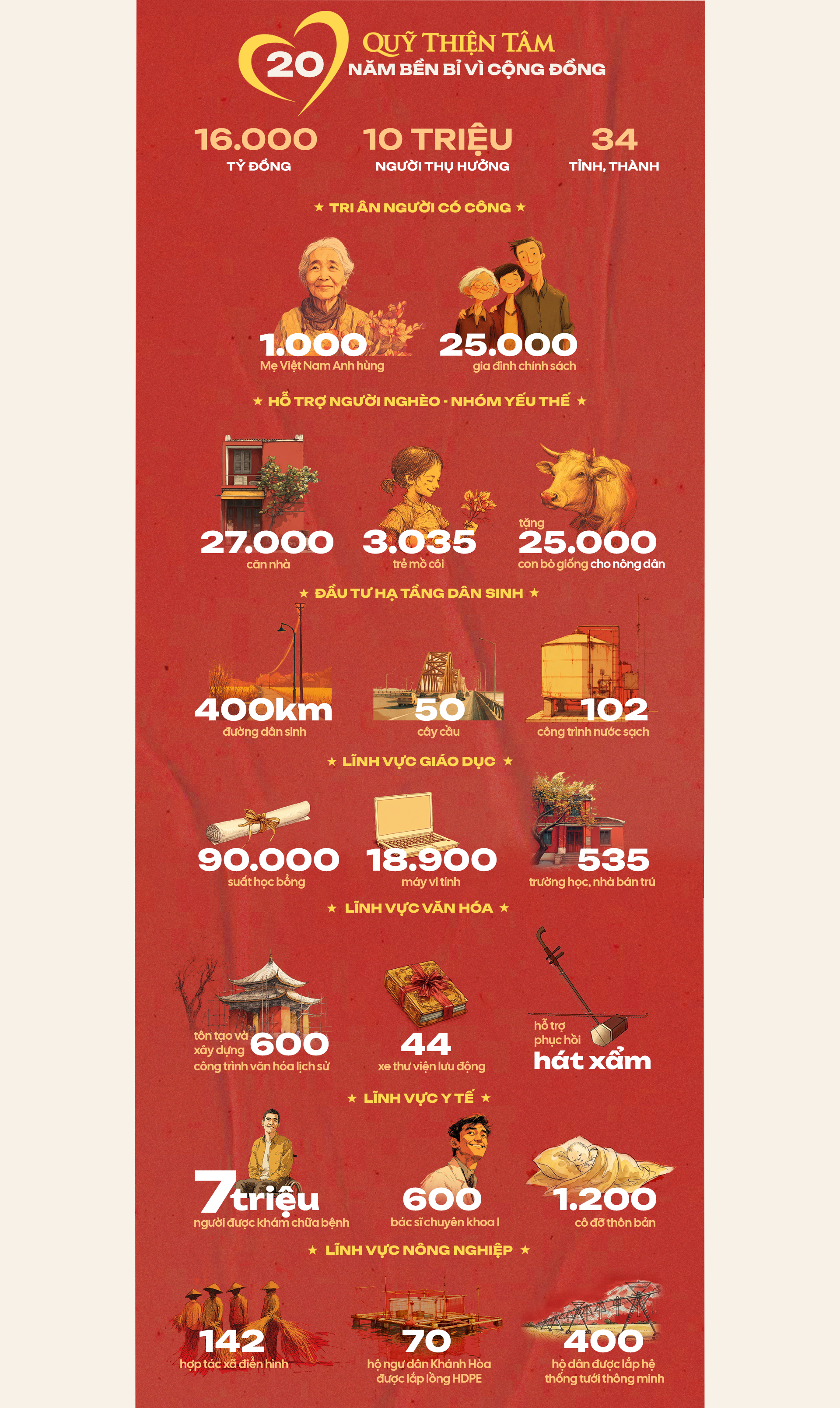 Riêng y tế, chúng tôi tổ chức khám - phát thuốc miễn phí cho hàng triệu người, phẫu thuật đục thủy tinh thể, đầu tư trang thiết bị và nâng cao năng lực cho trạm y tế vùng cao… Đặc biệt, Quỹ có hai dự án chiến lược về y tế, gồm: Tài trợ đào tạo 600 bác sĩ chuyên khoa I cho vùng sâu vùng xa và hỗ trợ 1.200 cô đỡ thôn bản; Tài trợ 1.000 tỷ đồng cho Đề án cấp cứu ngoại viện quốc gia 2025–2030.