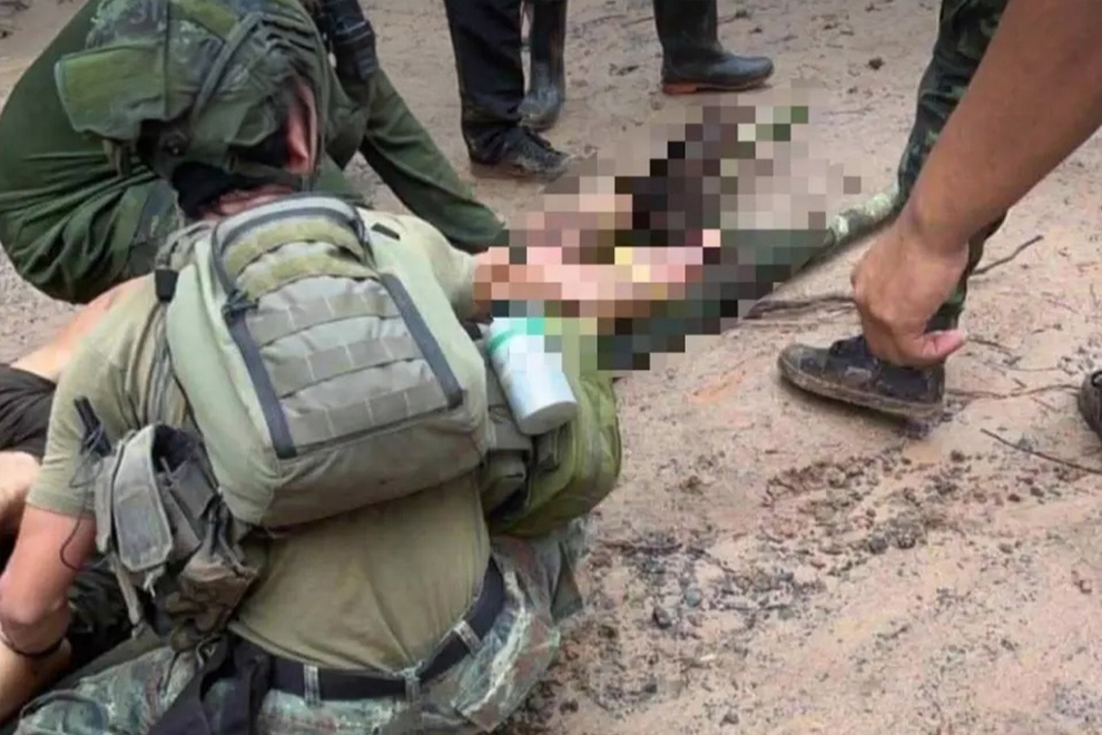 Một binh sĩ Thái Lan giẫm phải mìn và bị thương nặng, mất phần chân phải phía dưới. Ảnh: The Nation