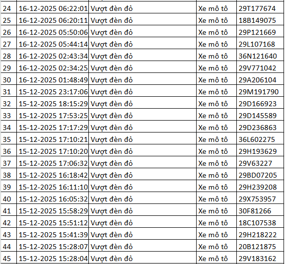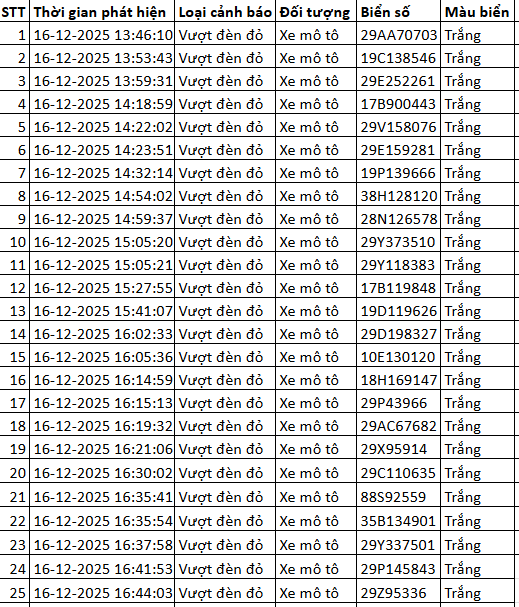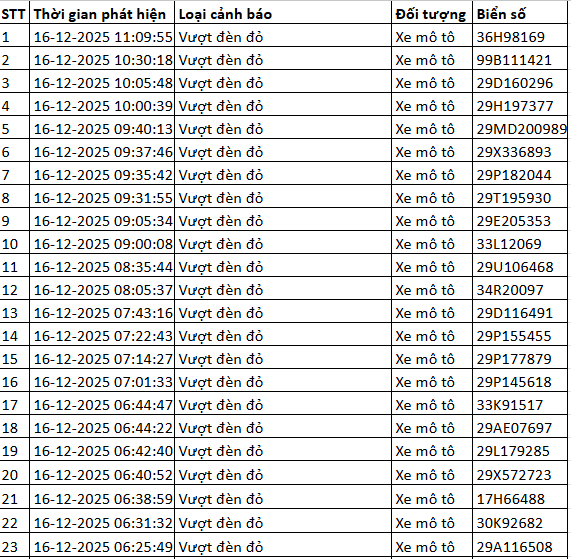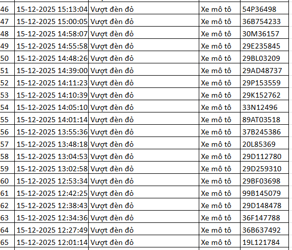 Từ 12h00’ ngày 15/12/2025 đến 12h00’ ngày 16/12/2025, qua trích xuất dữ liệu từ camera A.I được thí điểm lắp đặt tại nội đô Hà Nội (nút giao phố Phạm Văn Bạch - Hoàng Quán Chi), đã tự động phát hiện 65 trường hợp không chấp hành hiệu lệnh của đèn tín hiệu - vượt đèn đỏ (mô tô, xe gắn máy).