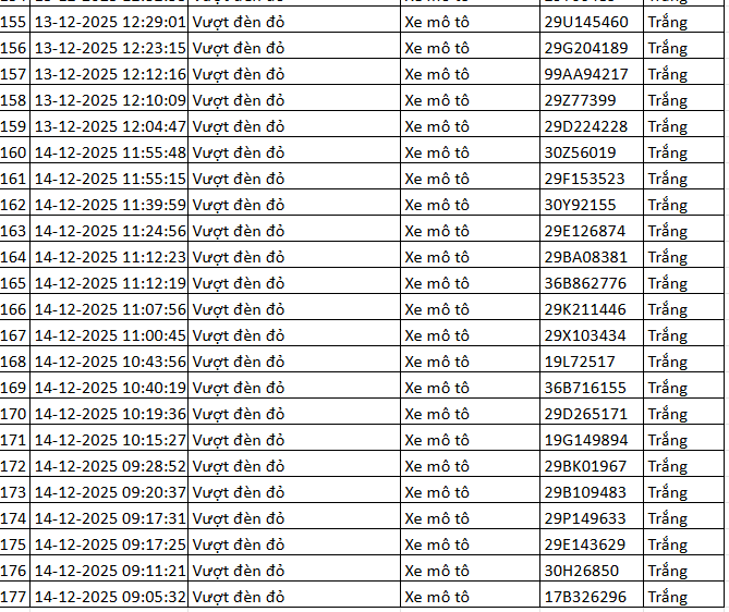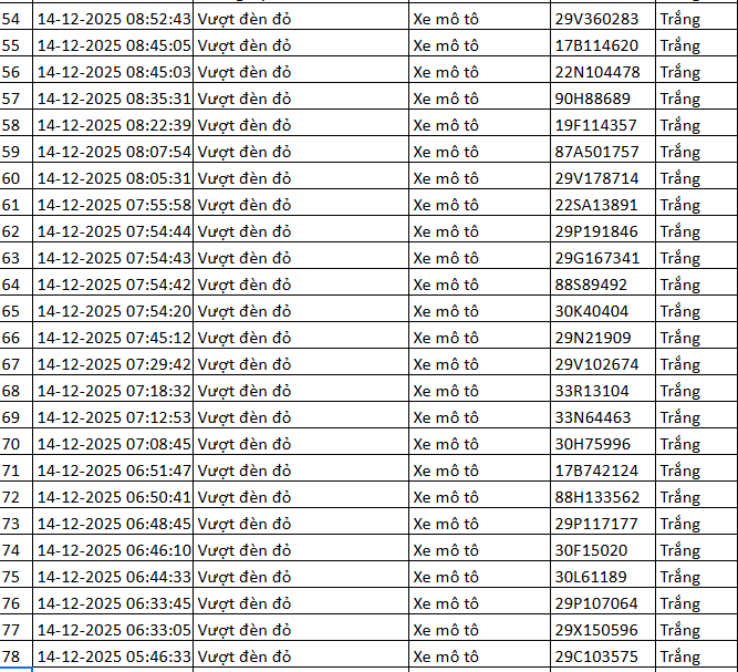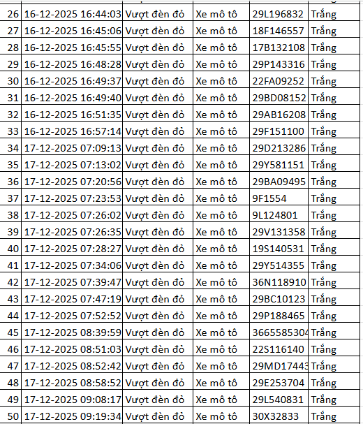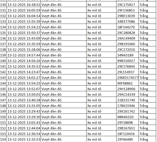 Từ 12h00’ ngày 13/12/2025 đến 12h00’ ngày 14/12/2025, Qua trích xuất dữ liệu từ camera A.I được thí điểm lắp đặt tại nội đô Hà Nội (nút giao phố Phạm Văn Bạch - Hoàng Quán Chi), đã tự động phát hiện 124 trường hợp không chấp hành hiệu lệnh của đèn tín hiệu - vượt đèn đỏ (mô tô, xe gắn máy).