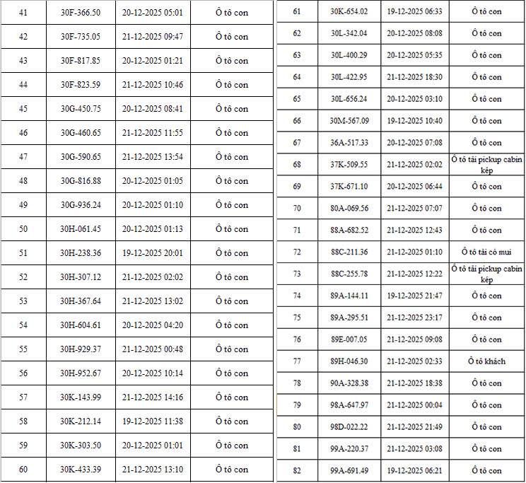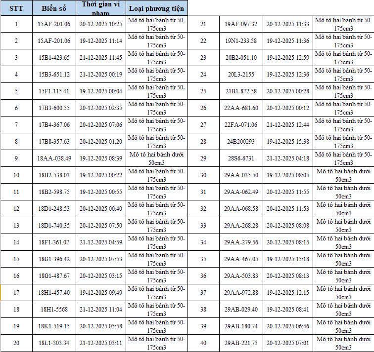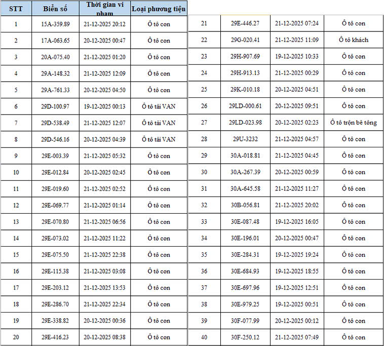Danh sách chi tiết các phương tiện bị phạt nguội như sau:
