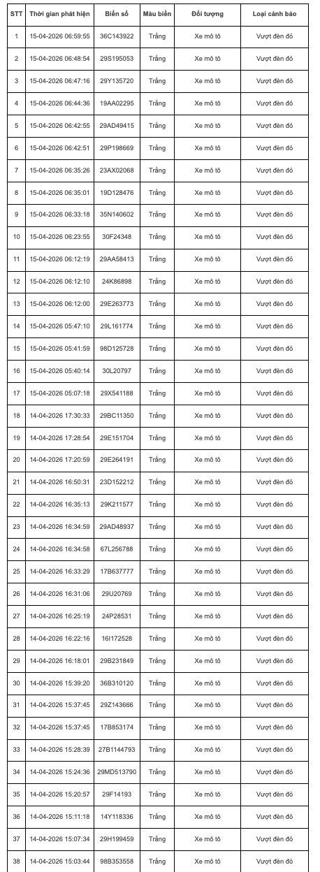 Tại Hà Nội, trong khoảng thời gian từ 7h30 ngày 14/4 đến 7h30 ngày 15/4, hệ thống camera AI trên cao tốc Nội Bài - Lào Cai và các nút giao nội đô đã phát hiện 135 trường hợp vi phạm. Các lỗi chủ yếu bao gồm: vượt đèn đỏ, không đội mũ bảo hiểm khi tham gia giao thông hay chạy quá tốc độ cho phép.