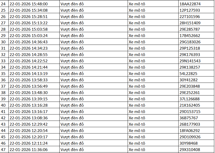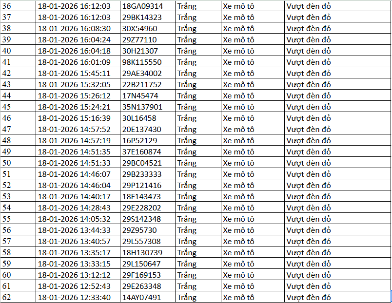 Từ 12h00’ ngày 21/1/2026 đến 12h00’ ngày 22/1/2026, đã phát hện 38 trường hợp xe máy vi phạm.