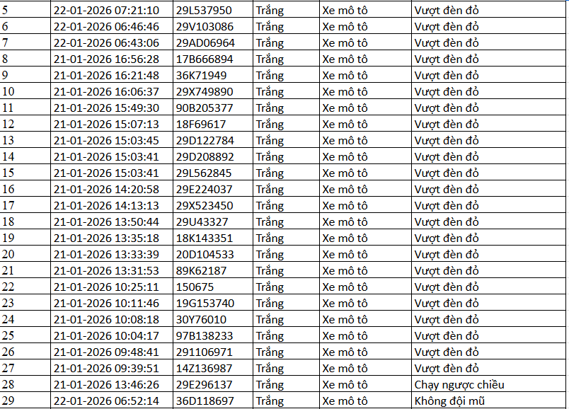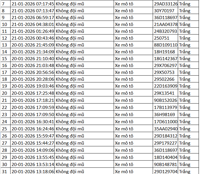 Từ 12h00’ ngày 20/1/2026 đến 12h00’ ngày 21/1/2026, đã phát hiện 42 trường hợp xe máy vi phạm.