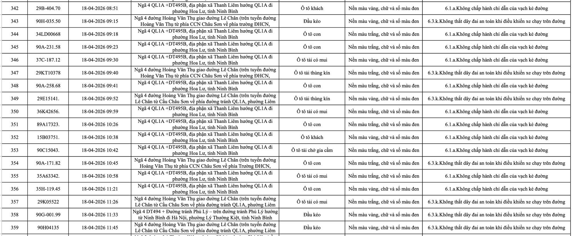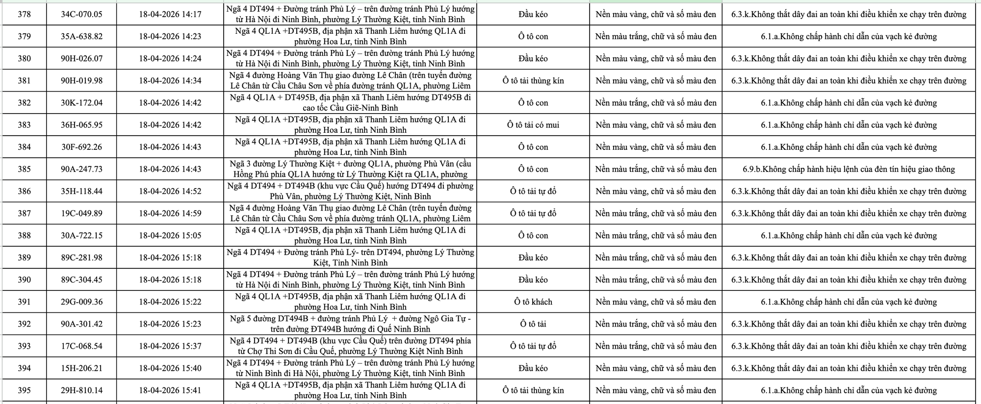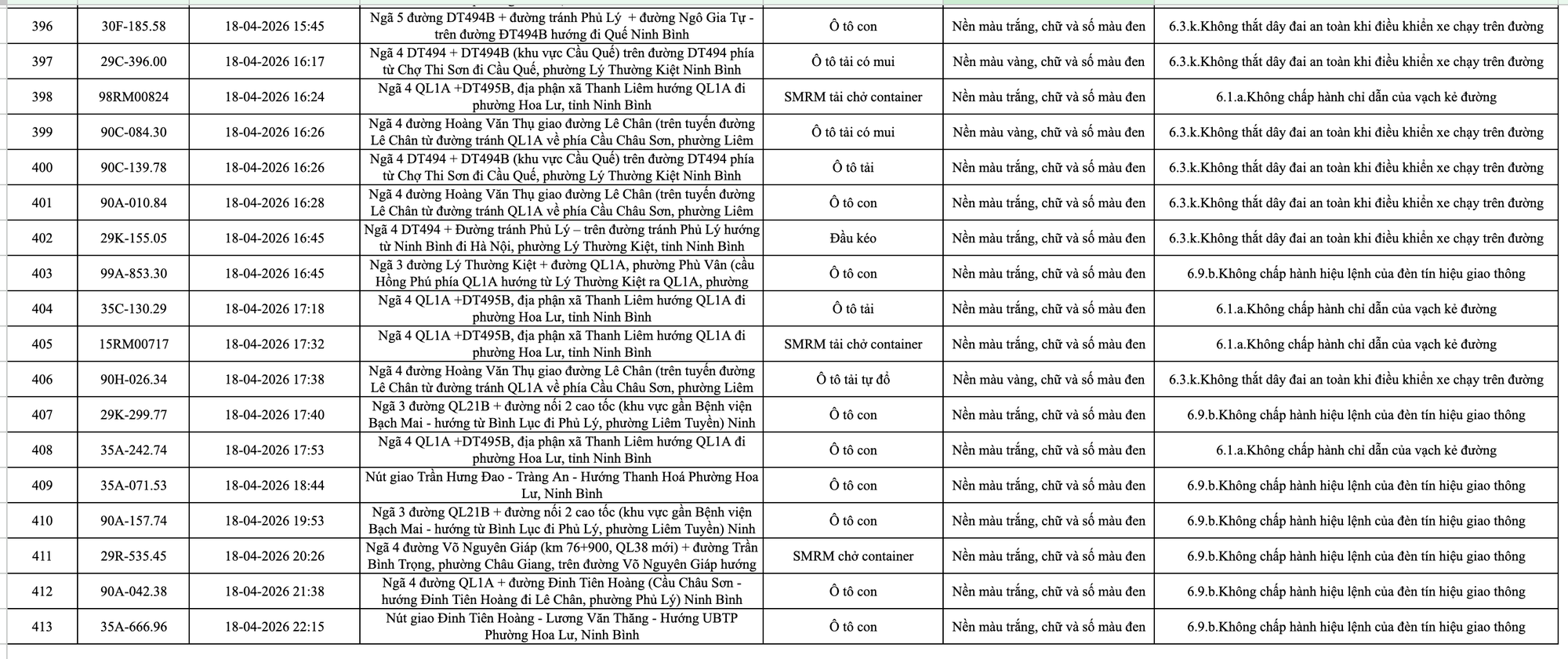 Phòng Cảnh sát giao thông, Công an tỉnh Ninh Bình cho biết, trong tuần qua, từ ngày 11/4/2026 đến ngày 18/4/2026, Phòng Cảnh sát giao thông, Công an tỉnh ghi nhận 413 lượt phương tiện vi phạm Luật Trật tự, an toàn giao thông đường bộ bị xử lý phạt nguội.