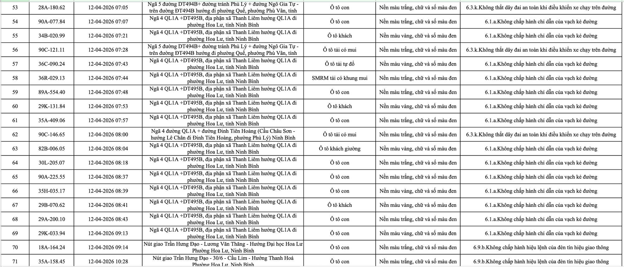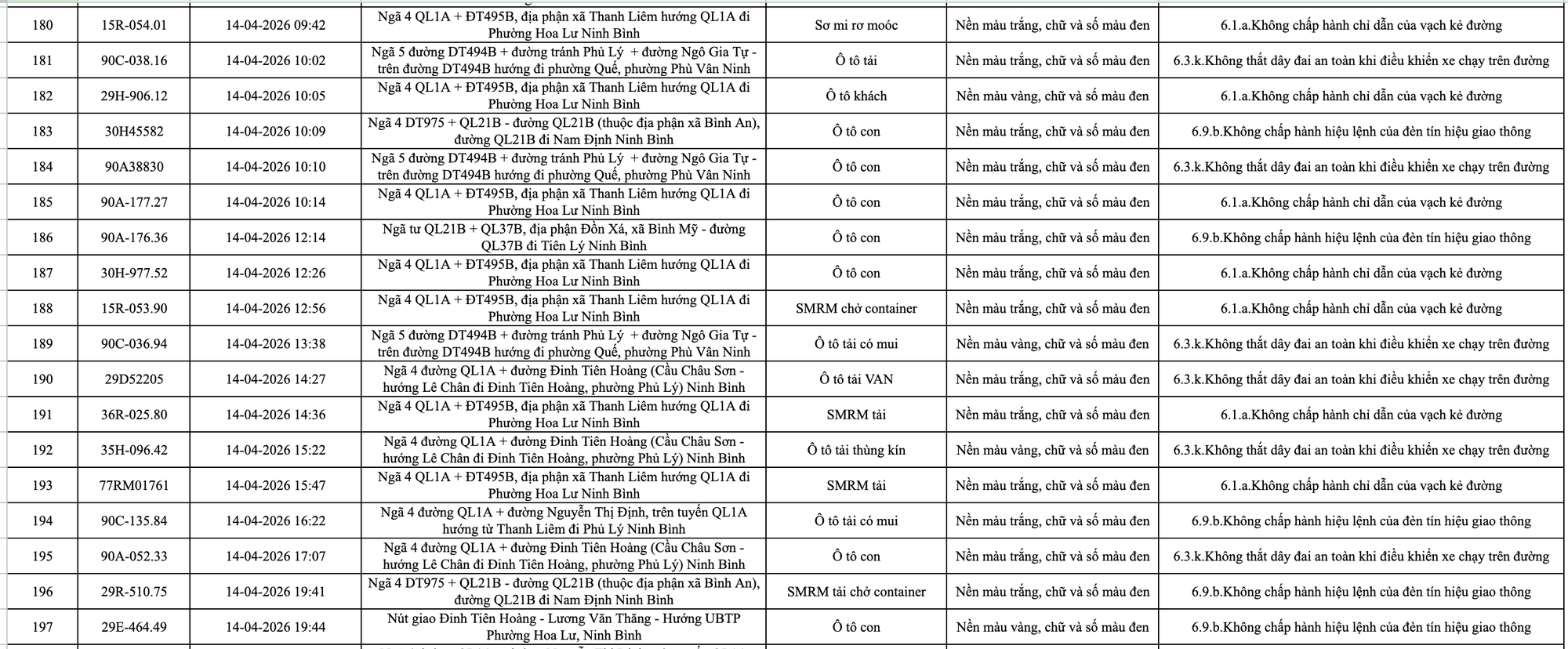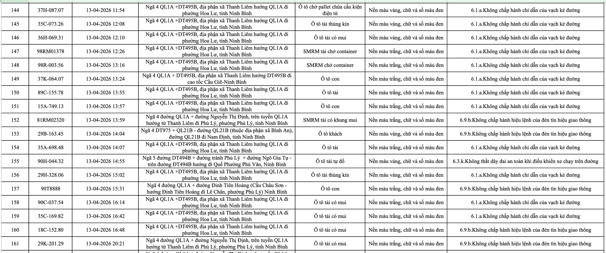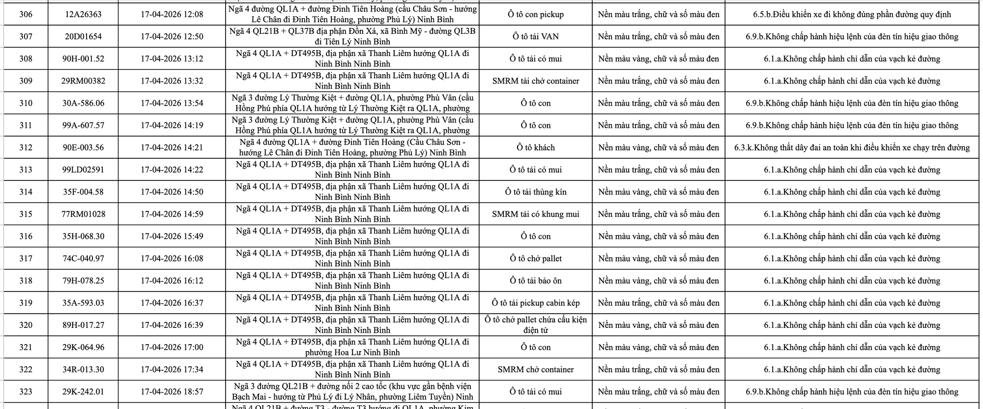 Phòng Cảnh sát giao thông, Công an tỉnh Ninh Bình cho biết, trong tuần qua, từ ngày 11/4/2026 đến ngày 18/4/2026, Phòng Cảnh sát giao thông, Công an tỉnh ghi nhận 413 lượt phương tiện vi phạm Luật Trật tự, an toàn giao thông đường bộ bị xử lý phạt nguội.