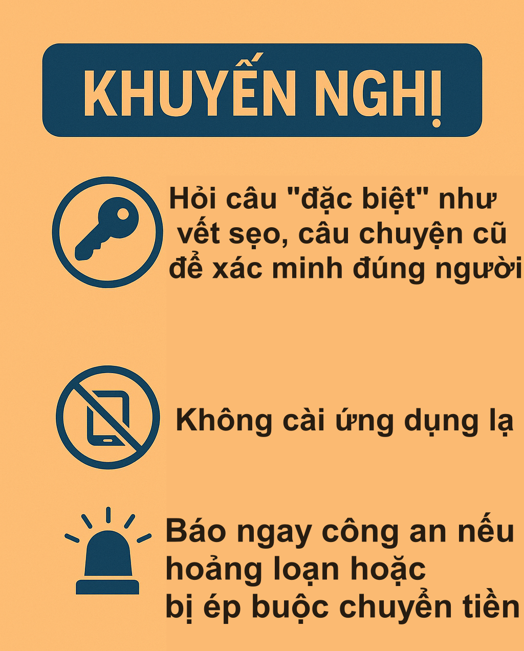 Tạo “mật mã gia đình”: Đặt một mật mã bí mật (ví dụ: một vết sẹo, một câu chuyện cũ) để khi nhận cuộc gọi video có thể xác minh đúng người thân.