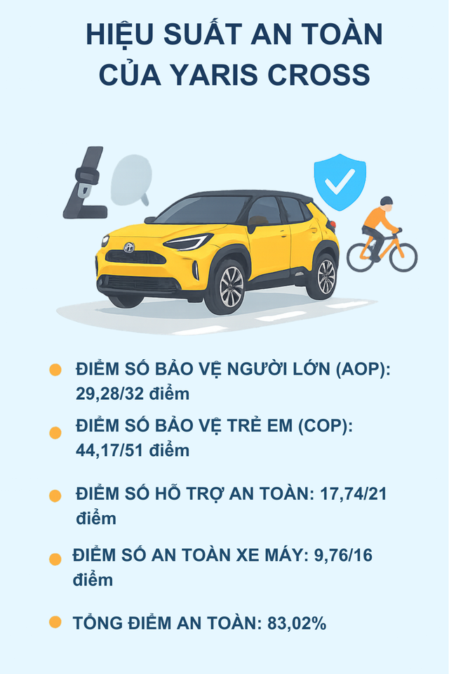 Cụ thể hơn, Yaris Cross đạt 29,28/32 điểm ở hạng mục bảo vệ người lớn (AOP), 44,17/51 điểm ở hạng mục bảo vệ trẻ em (COP), 17,74/21 điểm ở hạng mục hỗ trợ an toàn và 9,76/16 điểm ở hạng mục an toàn xe máy; tổng điểm là 83,02%. Chiếc xe đang được thử nghiệm theo giao thức đánh giá 2021-2025, năm cuối cùng trước khi các quy định mới có hiệu lực vào năm sau.