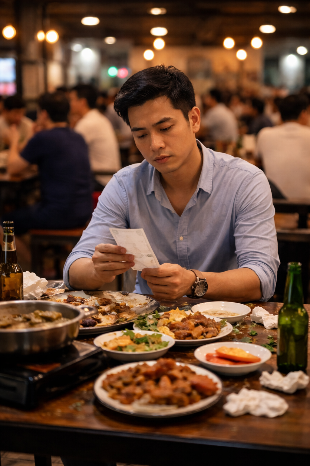 Bữa nhậu kéo dài, đồ ăn gọi liên tục. Tôi đã nghĩ lần này mình sẽ là người trả. Không phải để chứng minh điều gì, mà đơn giản là muốn đáp lại những gì họ từng làm cho mình, coi như một cách khép lại những áy náy trong lòng.