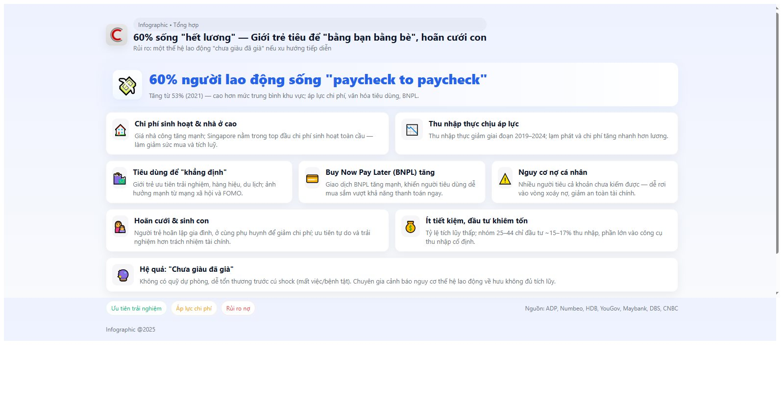Tỷ lệ 60% người dân sống theo kiểu "làm ra đồng nào hết đồng đó" (paycheck to paycheck) không chỉ là một con số, mà còn là hồi chuông cảnh tỉnh về sự xói mòn của thói quen tiết kiệm truyền thống. Đặc biệt, thế hệ trẻ Singapore đang định hình lại quan niệm về tiền bạc, ưu tiên trải nghiệm và "sống cho hiện tại" hơn là lo lắng về tương lai.