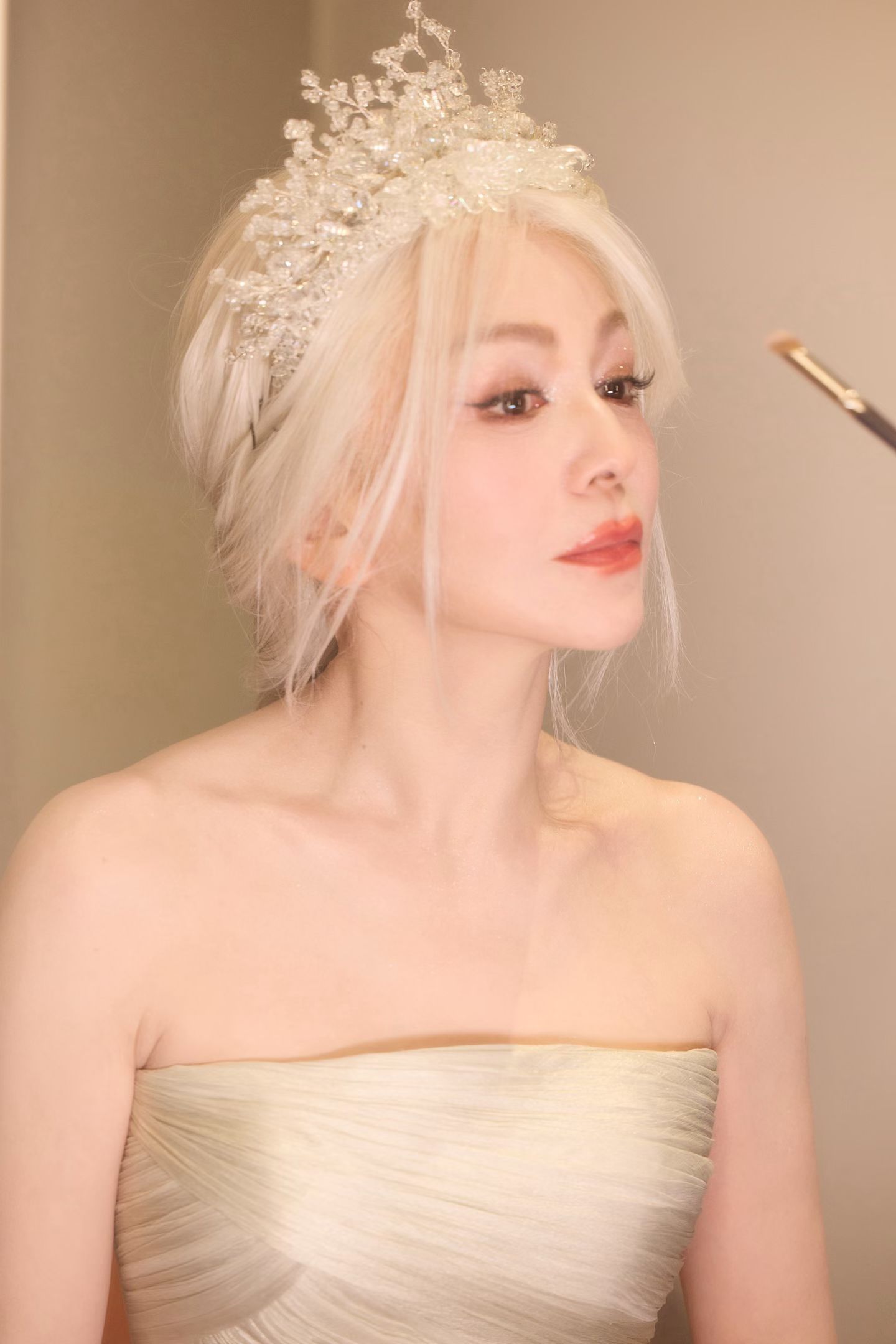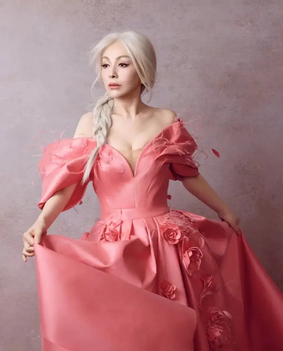 Trong loạt hình được chia sẻ, Vương Lâm diện một chiếc váy dạ hội màu hồng phấn, thiết kế trễ vai với phần thân ôm nhẹ và chân váy xòe rộng. Chất liệu vải đứng form kết hợp cùng các chi tiết đính hoa nổi tạo hiệu ứng mềm mại, bay bổng, gợi liên tưởng đến hình ảnh một nàng công chúa bước ra từ truyện cổ tích. Điểm nhấn đặc biệt nằm ở mái tóc bạc sáng - thay vì nhuộm đen như thường thấy tạo nên tổng thể vừa lạ mắt vừa sang trọng. Nhìn từ xa, nữ diễn viên như một nữ hoàng tuyết đầy quyến rũ