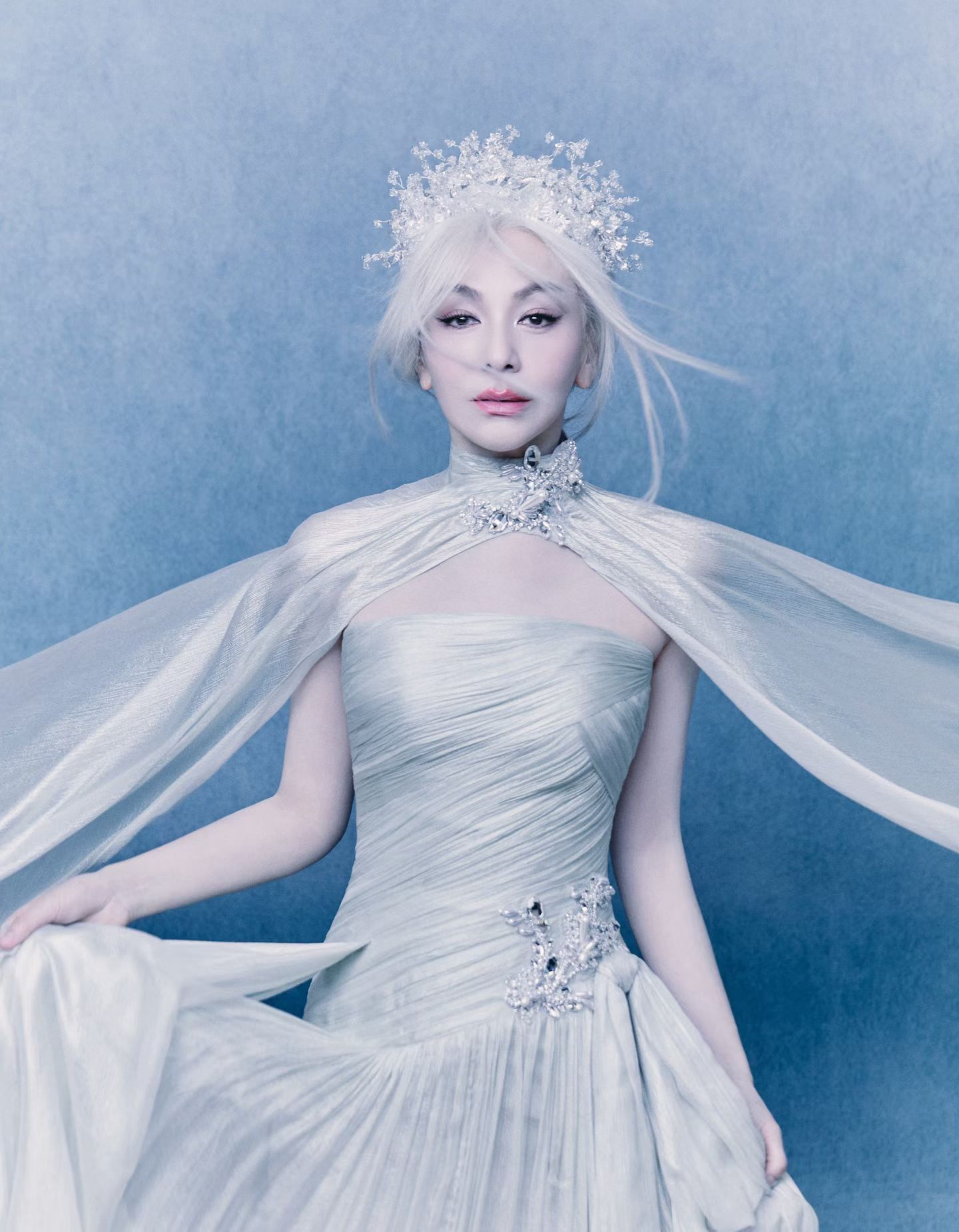 Cùng sự kiện, Vương Lâm còn gây ấn tượng mạnh với một tạo hình hoàn toàn khác khiến dân tình không thể không liên tưởng đến Elsa - Nữ hoàng băng giá. Trong bộ trang phục tông trắng xanh, cô khoác lên mình chiếc váy dạ hội xếp ly tinh xảo, kết hợp cùng áo choàng nhẹ bay và vương miện đính kết cầu kỳ. Tổng thể tạo hình gợi liên tưởng đến hình ảnh nữ hoàng tuyết vừa thanh thoát vừa quyền lực. Việc diện một mẫu váy "lồng lộn" như vậy mà vẫn giữ được khí chất ở độ tuổi U60 như Vương Lâm đúng là không ai làm được.