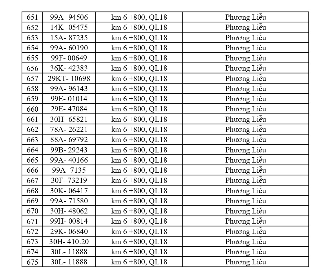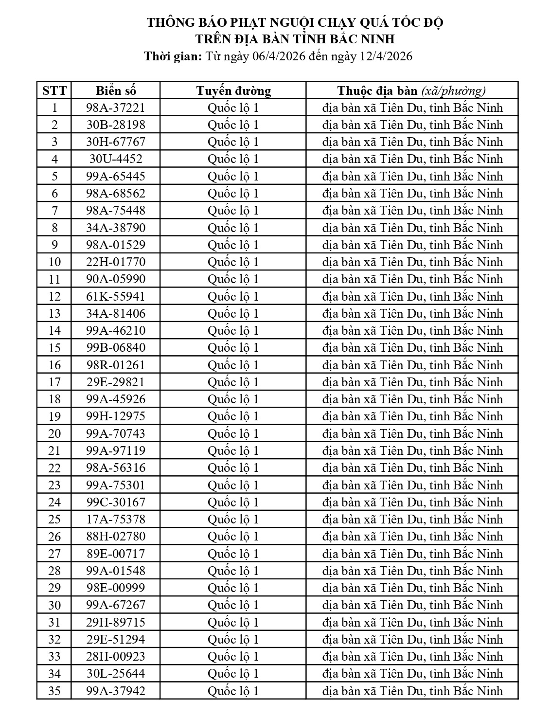 Phòng Cảnh sát giao thông Công an tỉnh Bắc Ninh thông báo, trong tuần từ ngày 06/4/2026 đến ngày 12/4/2026, đã phát hiện 675 trường hợp vi phạm trật tự an toàn giao thông - lỗi chạy quá tốc độ qua hệ thống camera giám sát giao thông và phương tiện, thiết bị kỹ thuật nghiệp vụ.
