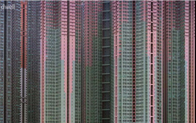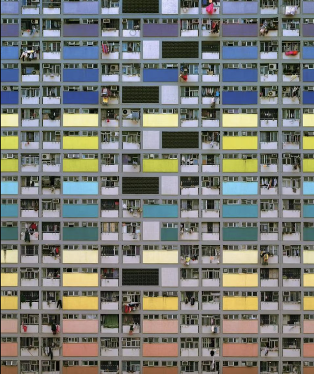 Khi ngước nhìn từ dưới lên, ta dễ có cảm giác choáng ngợp trước hiện thực đô thị nén chặt. Hàng trăm ô cửa sổ san sát chen chúc nhau trên bề mặt tường loang lổ, cũ kỹ theo thời gian. Xen kẽ vào đó là mạng lưới dây điện chằng chịt, cùng quần áo phơi lơ lửng vô tình tạo nên một bức tranh đô thị rối rắm nhưng đầy chân thực, phơi bày trọn vẹn diện mạo đời sống sinh hoạt của người dân Hong Kong trong không gian chật hẹp.