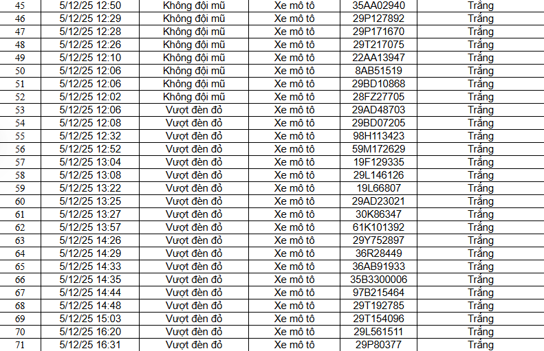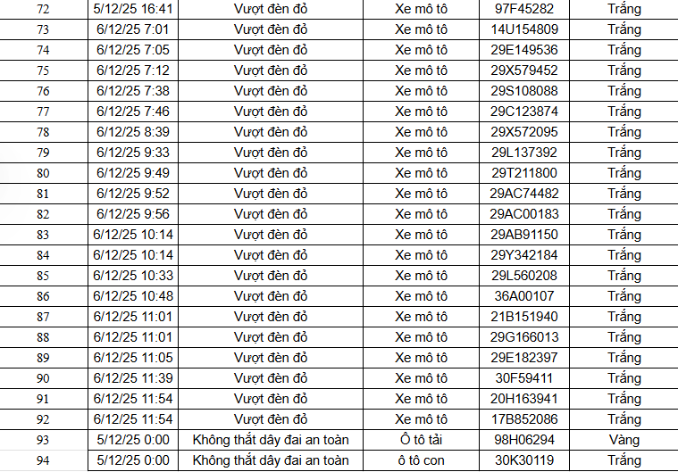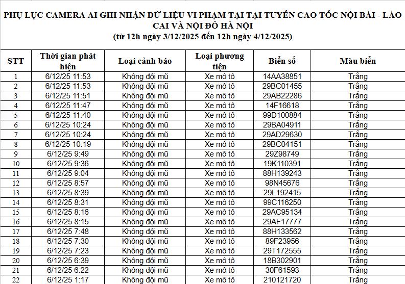 Ngày 6/12, Cục Cảnh sát Giao thông đã có thông báo về việc camera AI phát hiện tổng cộng 94 trường hợp xe máy, ô tô vi phạm trật tự, an toàn giao thông. Danh sách được ghi nhận từ ngày 5/12 đến ngày 6/12, với các lỗi được phát hiện trên tuyến cao tốc Nội Bài - Lào Cai và trên tuyến các tuyến đường nội đô Hà Nội.