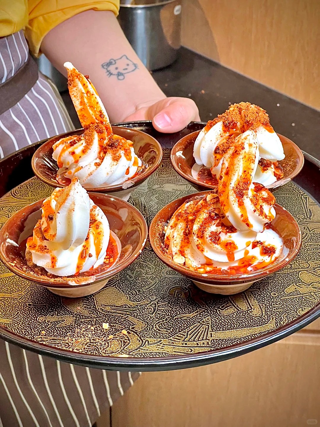 Dạo bước trên con phố ẩm thực Bát Nhất sầm uất bậc nhất Trùng Khánh, không khó để bạn bắt gặp những đám đông du khách hiếu kỳ đang vây quanh quầy bán món kem dầu ớt đỏ rực đầy thách thức này. Theo chân một vị khách du lịch dũng cảm vừa tậu cho mình một phần ăn thử với giá không hề rẻ, chúng ta mới thấy rõ độ bạo gan của người bán khi họ không ngần ngại múc một muỗng dầu ớt đặc sệt, lềnh bềnh hạt tiêu và ớt bột rưới thẳng lên lớp kem sữa tươi mát lạnh lấp lánh.