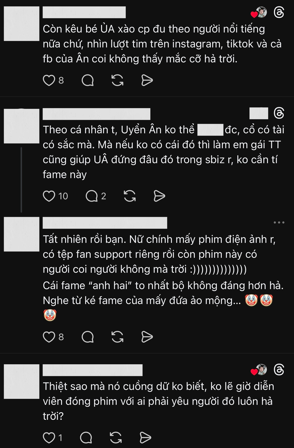 Đáng nói, việc Uyển Ân đăng tải loạt ảnh có chi tiết trùng hợp vào đúng thời điểm cặp đôi Gia Huy - Triều Dâng đang tích cực quảng bá phim càng khiến một bộ phận fan couple cảm thấy khó chịu. Không ít người cho rằng động thái này dễ gây hiểu lầm, thậm chí làm ảnh hưởng đến chiến dịch truyền thông của bộ phim. Từ đó, một số bình luận tiêu cực đã xuất hiện, hướng thẳng về phía Uyển Ân.