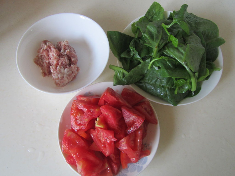 Nguyên liệu cần chuẩn bị: 1 mớ rau mồng tơi, 1 quả cà chua, 150g thịt nạc vai băm nhỏ, 1 cây hành lá, một chút bột tiêu, một chút gia vị.