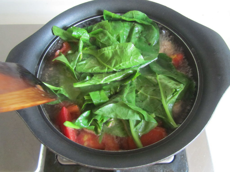 - Cho lượng nước vừa đủ vào nồi, đun sôi ở lửa lớn rồi vặn nhỏ. Bạn nắm thịt băm thành các viên nhỏ rồi thả vào nồi nước sôi. Khi các viên thịt nổi lên thì bạn cho cà chua vào, tiếp tục nấu sôi. Khi cà chua chín mềm thì bạn nêm thêm gia vị cho vừa ăn. Cuối cùng bạn thả rau mồng tơi vào, đun đến khi chín (đổi màu xanh đậm) thì tắt bếp. Lấy canh ra khỏi nồi và thưởng thức.