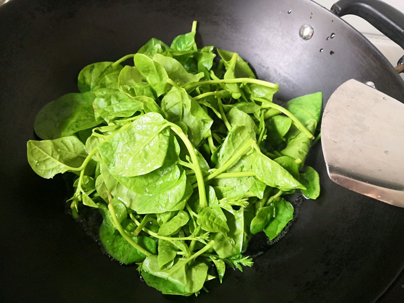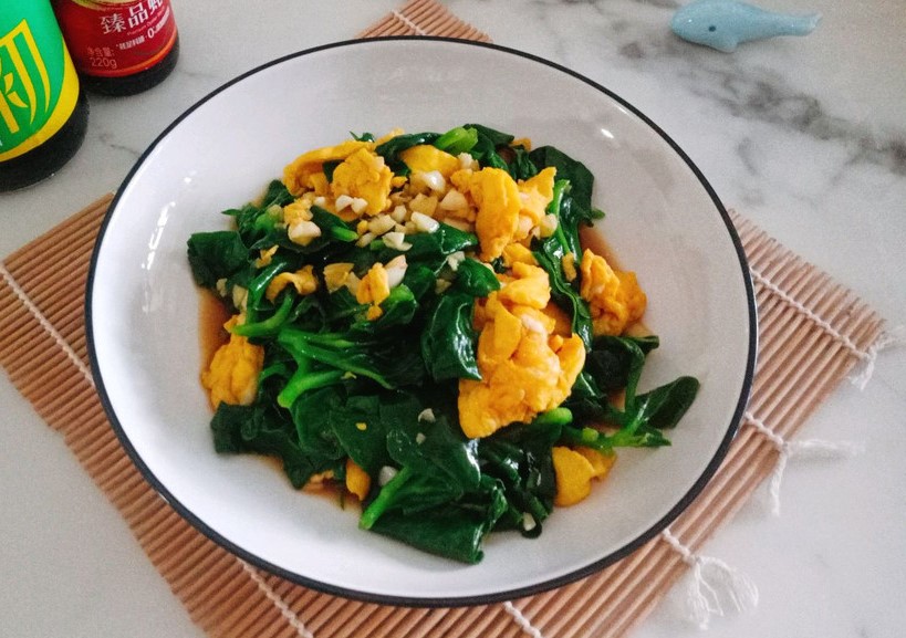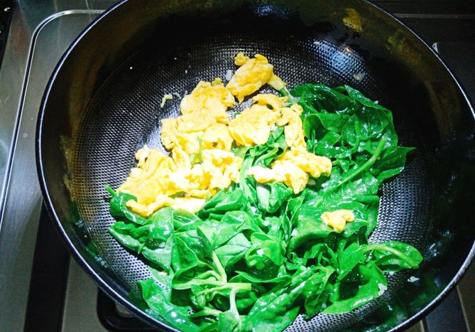 - Khi tỏi đã được phi thơm sém cạnh, bạn cho rau mồng tơi vào xào nhanh. Thêm trứng rồi cho một chút dầu hào và nước tương, chút xíu gia vị vừa ăn, đảo đều. Cho lượng tỏi băm còn lại vào, xào thật nhanh tay. Khi các nguyên liệu chín, ngấm đều gia vị thì lấy ra đĩa và thưởng thức.