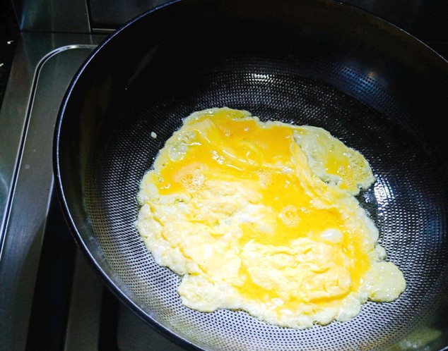 - Nhặt và rửa sạch rau mồng tơi, để cho ráo nước. Đập trứng vào bát tô và đánh tan. Tỏi bóc vỏ, đập dập, băm nhỏ. Đun nóng dầu trong chảo, đổ trứng vào chiên khi chín rồi xắt miếng nhỏ, lấy ra và đặt sang một bên. Cho thêm một chút dầu vào chảo, thêm 1/2 lượng tỏi băm vào phi thơm.