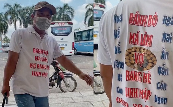 Chưa hết, người đàn ông này còn mặc một chiếc áo rất ấn tượng, gây chú ý với dòng chữ: "Bánh bò má làm, vợ rang mè - Linh Mập". Đằng sau lưng còn có thêm cả nội dung vô cùng độc đáo: "Mua về để tặng bà con, ngày mai ăn vẫn còn ngon". Kèm theo đó là số điện thoại liên hệ.