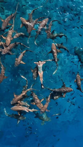 Cá mập nhám tại Maldives vốn nổi tiếng là loài vật thân thiện với con người. Tuy nhiên, việc bơi giữa đàn cá có kích thước lớn vẫn đòi hỏi sự bình tĩnh và kỹ năng xử lý dưới nước điêu luyện. Với kỹ thuật bơi chuyên nghiệp, Ánh Viên trông hoàn toàn thư thái như đang khiêu vũ giữa đại dương, tạo nên những khung hình đầy tính nghệ thuật.