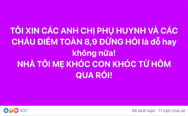 Một phụ huynh Hà Nội đã không giấu nổi cảm xúc, viết trong một nhóm kín: "Tôi xin các anh chị phụ huynh và các cháu điểm toàn 8, 9 đừng hỏi là đỗ hay không nữa! Nhà tôi mẹ khóc, con khóc từ hôm qua rồi!".