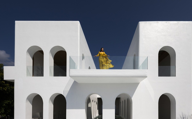 Căn biệt thự màu trắng nổi bật giữa khu phố.