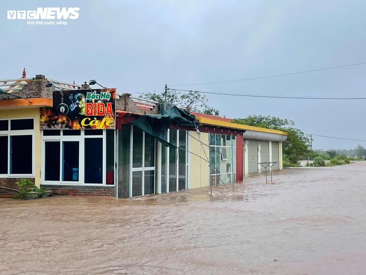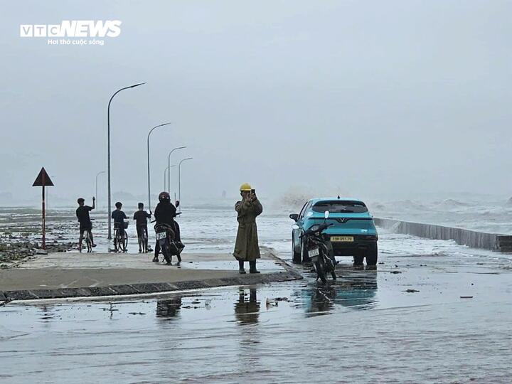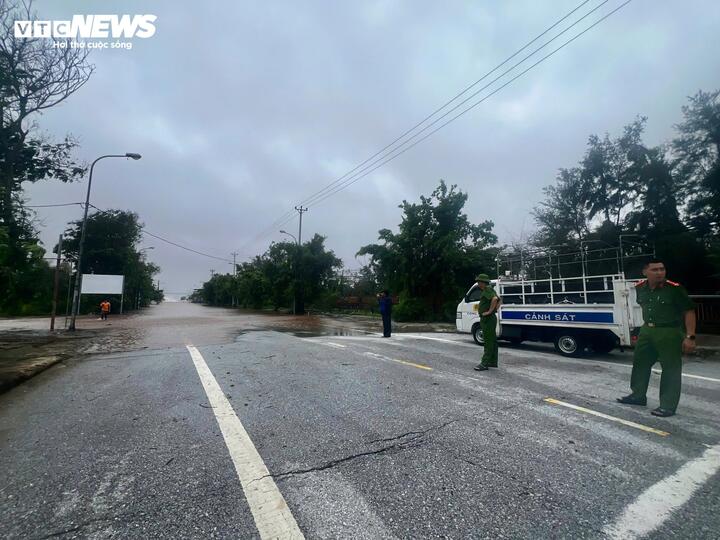 Lực lượng chức năng lập chốt tại đầu điểm ngập để ngăn chặn người dân tiến ra khu vực bờ biển, đồng thời đảm bảo các công tác an toàn phòng chống bão.