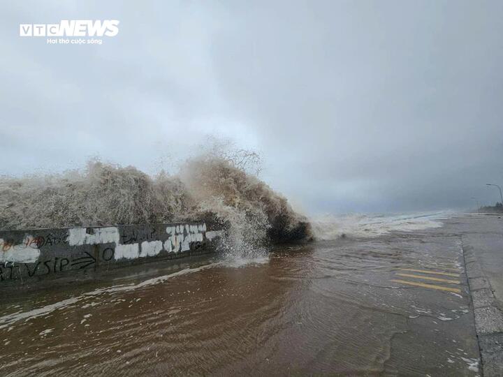 Liên tiếp cơn sóng cao, cuồn cuộn dội vào bờ, tung bọt trắng xóa.