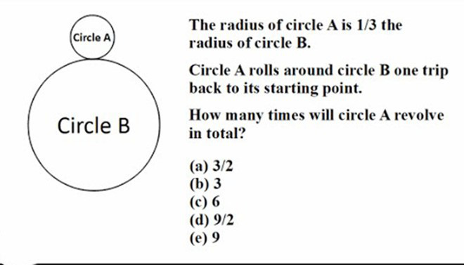 Trước yêu câu này, không chỉ phần lớn các thí sinh trong kỳ thi năm ấy chọn đáp án (b) mà nhiều người hứng thú với toán học cũng đưa ra lựa chọn tương tự, với lý luận rằng chu vi hình tròn B gấp 3 lần hình A, vậy nên hình A chỉ cần quay đúng 3 vòng để đi hết chu vi hình B.