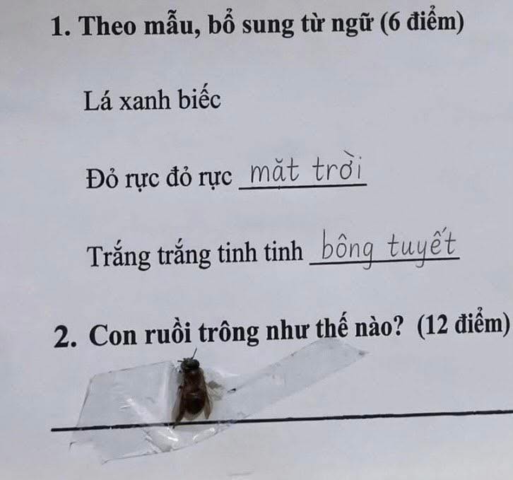 Thay vì sử dụng các tính từ miêu tả thông thường như "nhỏ xíu", "đen thui" hay "có đôi cánh mỏng" như bạn bè đồng trang lứa, học sinh này đã chọn một nước đi... không ai lường trước được. Để trả lời cho câu hỏi, bạn nhỏ đã bắt ngay một chú ruồi thật và dùng băng dính dán ngay ngắn vào tờ giấy bài tập. Cách trả lời mang tính "vật chứng" này khiến câu hỏi về hình dáng con ruồi trở nên trực quan sinh động hơn bao giờ hết.