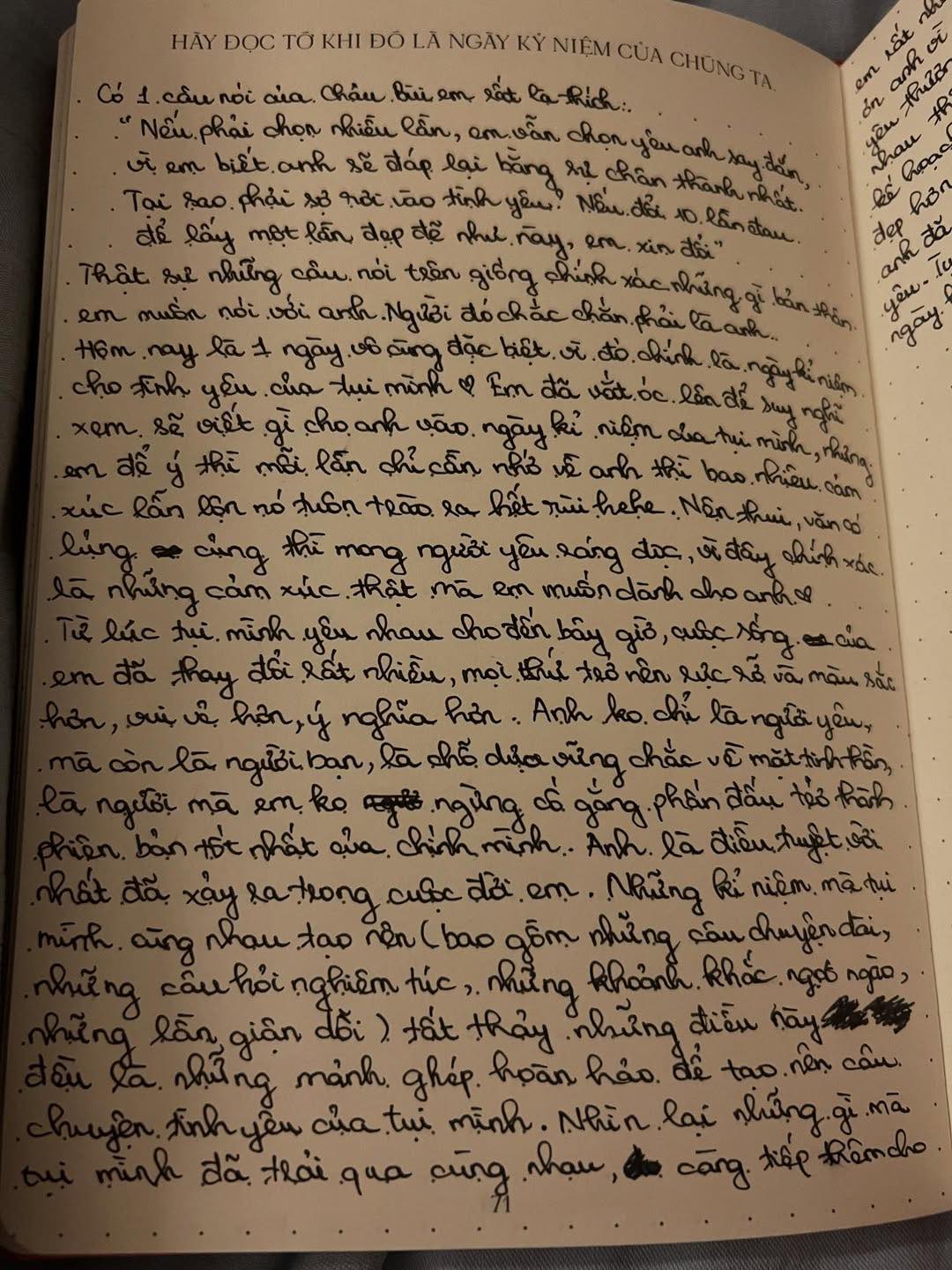 [...] Từ lúc tụi mình yêu nhau cho đến giờ cuộc sống của em đã thay đổi rất nhiều, mọi thứ trong cuộc sống ý nghĩa hơn, vui vẻ hơn, ý nghĩa hơn. Anh không chỉ là người yêu mà còn là người bạn, là chỗ dựa vững chắc mỗi lúc em yếu mềm, là người mà em không ngừng cố gắng phấn đấu trở thành phiên bản tốt nhất của chính mình. Anh là điều tuyệt vời nhất đã xảy ra trong cuộc đời em” .