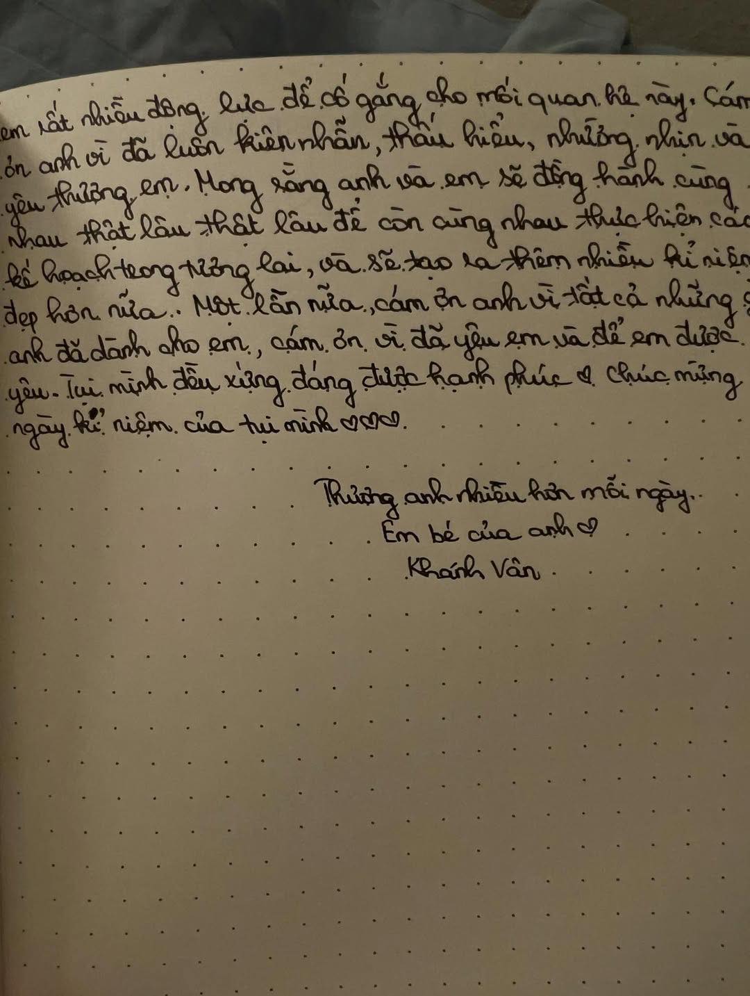Trên trang cá nhân mới đây, TikToker Bốp bày tỏ: “Cuối cùng, tôi cũng đã được lấy lại điện thoại, và đây là bức ảnh tôi muốn đọc nhất”. Kèm theo đó, anh đăng tải 2 trang thư viết tay của Khánh Vân nhân ngày kỷ niệm của cả hai,